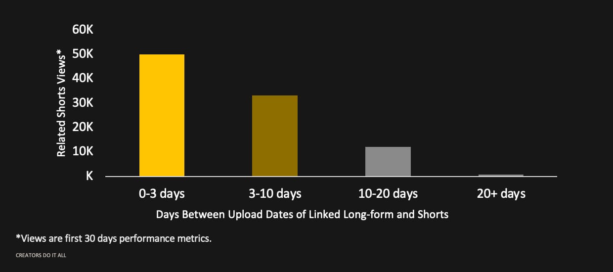 Interestingly, Shorts posted within three days of the long-form video drove more long-form views than other Shorts. This trend can be attributed to the fact that Shorts typically experience their highest viewership within the first seven days, after which viewership rapidly declines.