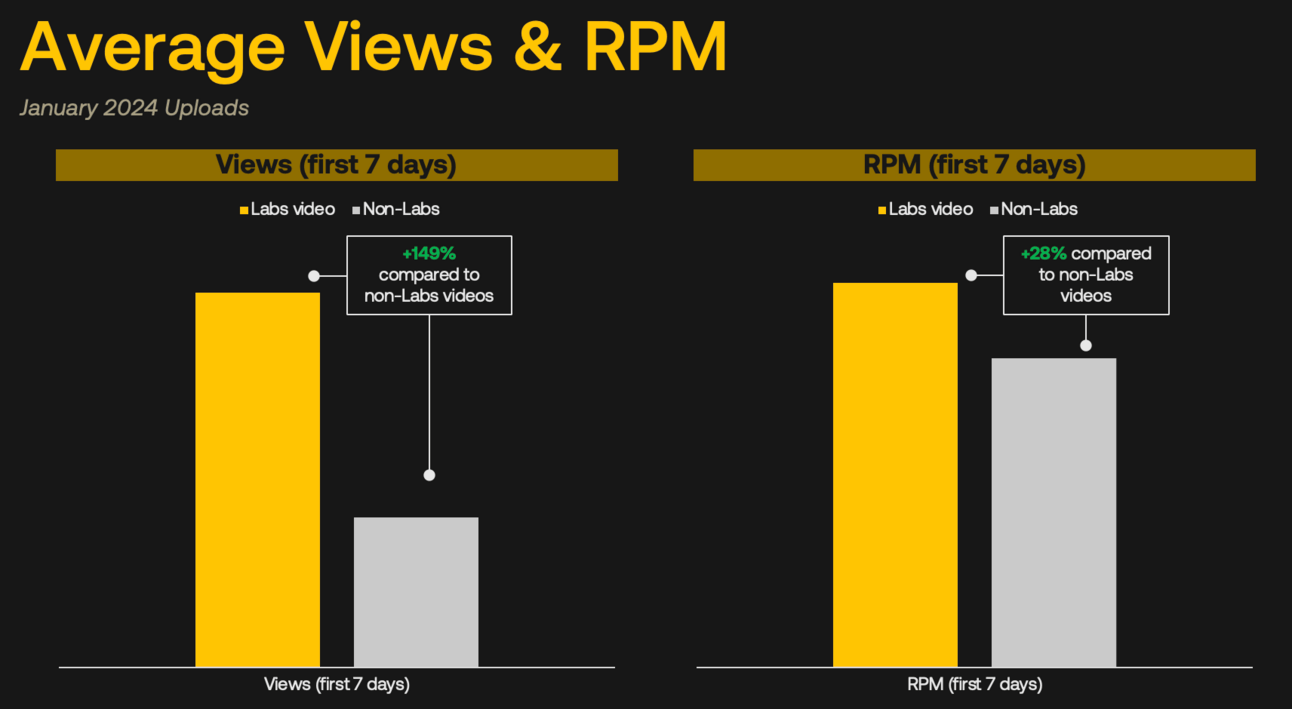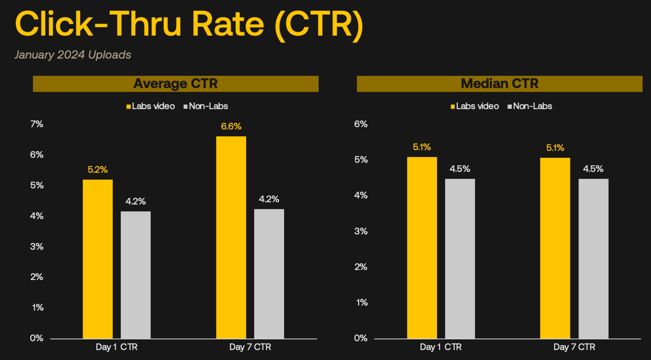 1% higher day 1 average CTR and 2.4% higher day 7 CTR on Labs video compared to non-Labs videos
