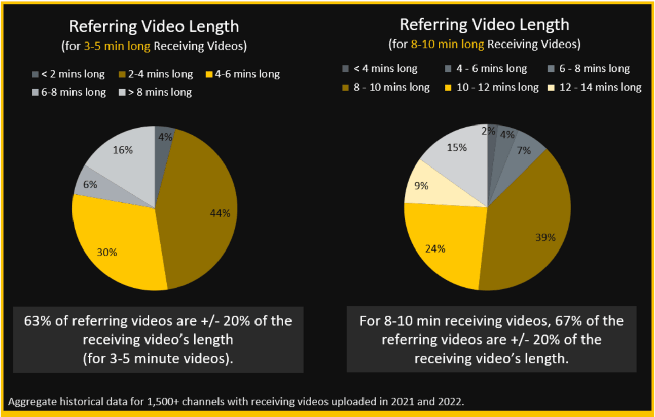 In fact, we found that 63% of referring videos were +/- 20% of the receiving video’s length for 3–5-minute videos. And for 8–10-minute receiving videos, it was 67%.